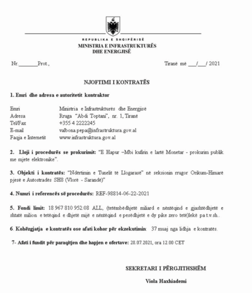 Ministria e Infrastrukturës shpalli tenderin për ndërtimin e tunelit të Llogarasë në dhjetor 2020. Kompania shqiptare “Gjoka Konstruksion” paraqiti ofertën më të ulët, rreth 140 milionë euro, por tenderi u anulua pa ndonjë shpjegim.