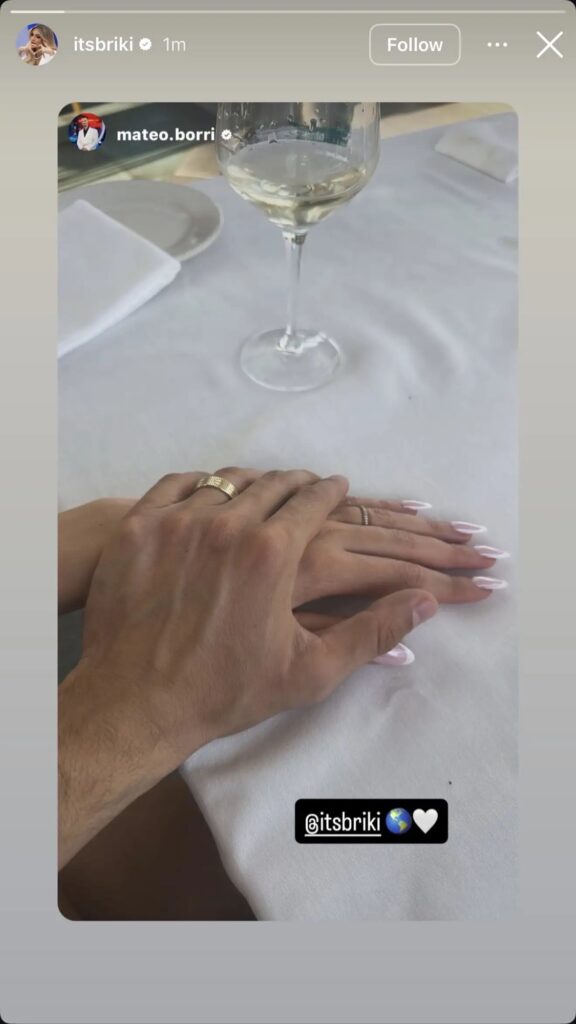 Së fundmi, Mateo ka ndarë në rrjetet sociale një fotografi ku shfaqet duke i mbajtur dorën Brikenës. Në fokus të imazhit bien pikërisht unazat që të dy vazhdojnë t’i mbajnë, duke nxitur reagime dhe komente nga ndjekësit e tyre. Postimi është interpretuar nga fansat si një konfirmim i qartë se marrëdhënia e tyre po vijon edhe jashtë kamerave.