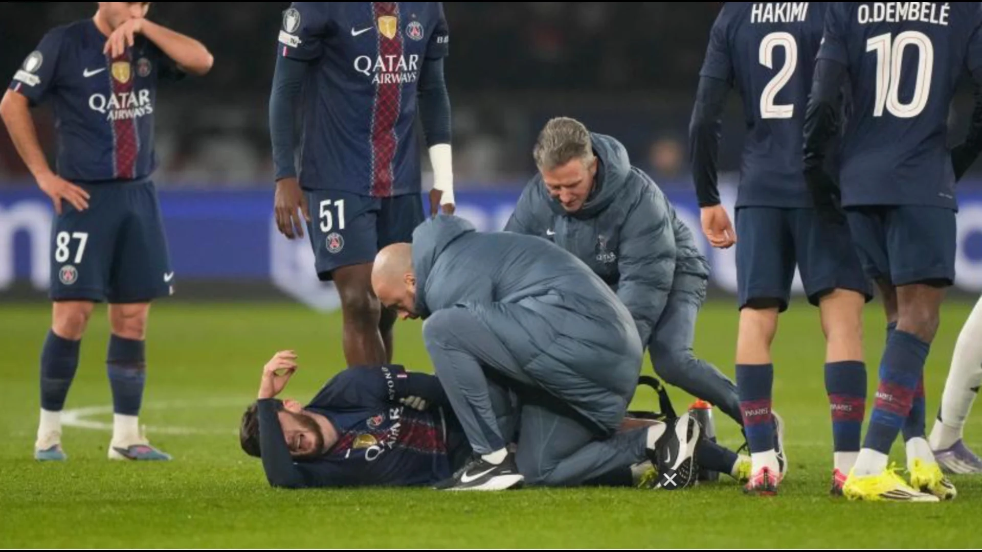 Megjithatë, atmosfera pozitive u prish nga një lëndim i rëndë i një prej yjeve të PSG-së, Kvicha Kvaratskhelia, i cili u detyrua të largohej nga fusha pas vetëm 22 minutash lojë. Lëndimi duket serioz, pasi Kvaratskhelia nuk arriti të vazhdojë ndeshjen dhe iu desh asistenca e stafit mjekësor të klubit. Mjekët e skuadrës e përballën me kujdes dhe të shqetësuar, duke e ndihmuar të largohet nga fusha, ndërsa Luis Enrique, trajneri i PSG-së, shprehu brengosjen e tij për rezultatet e ekzaminimeve të ardhshme.