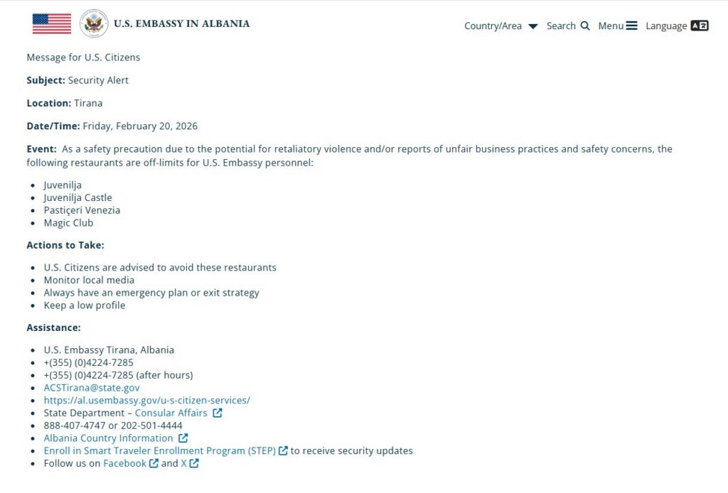 Ambasada e Shteteve të Bashkuara në Tiranë ka lëshuar një njoftim të rrallë sigurie, duke këshilluar qytetarët amerikanë të shmangin disa lokale në kryeqytet për shkak të rrezikut të mundshëm të dhunës hakmarrëse dhe shqetësimeve për sigurinë. Në paralajmërimin e shpërndarë përmes kanaleve zyrtare, ambasada iu bën thirrje shtetasve amerikanë të tregojnë kujdes të shtuar, të shmangin ambientet e përmendura dhe të monitorojnë njoftimet për përditësime të mëtejshme mbi situatën.