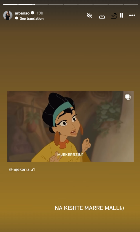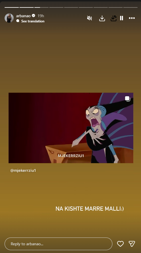 Arbana publikoi një video ironike në InstaStory, nga faqja e njohur e memeve ne rrjetet sociale, “Mjekerziu”, ku zëri i Elsës ishte vendosur te një kukull nga filmi “Çmenduritë e Perandorit Kusko”. Ky gjest u pa si një përgjigje e hollë, por e fortë ndaj thumbit të këngëtares.