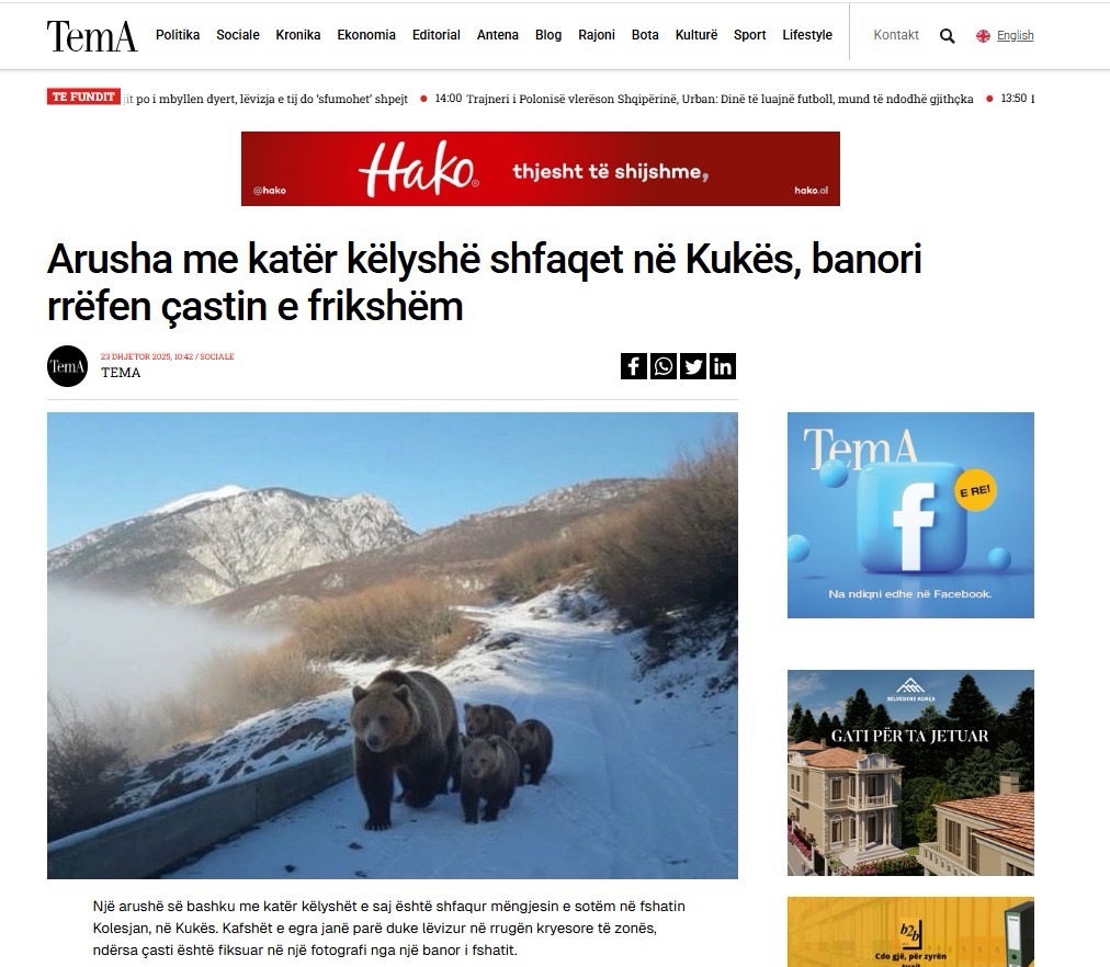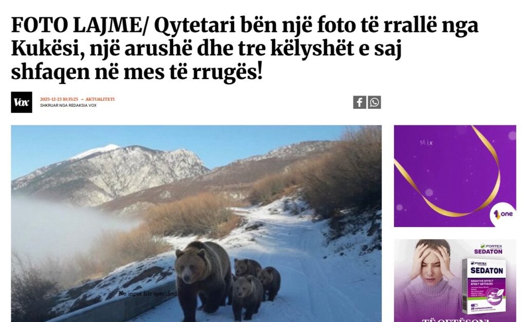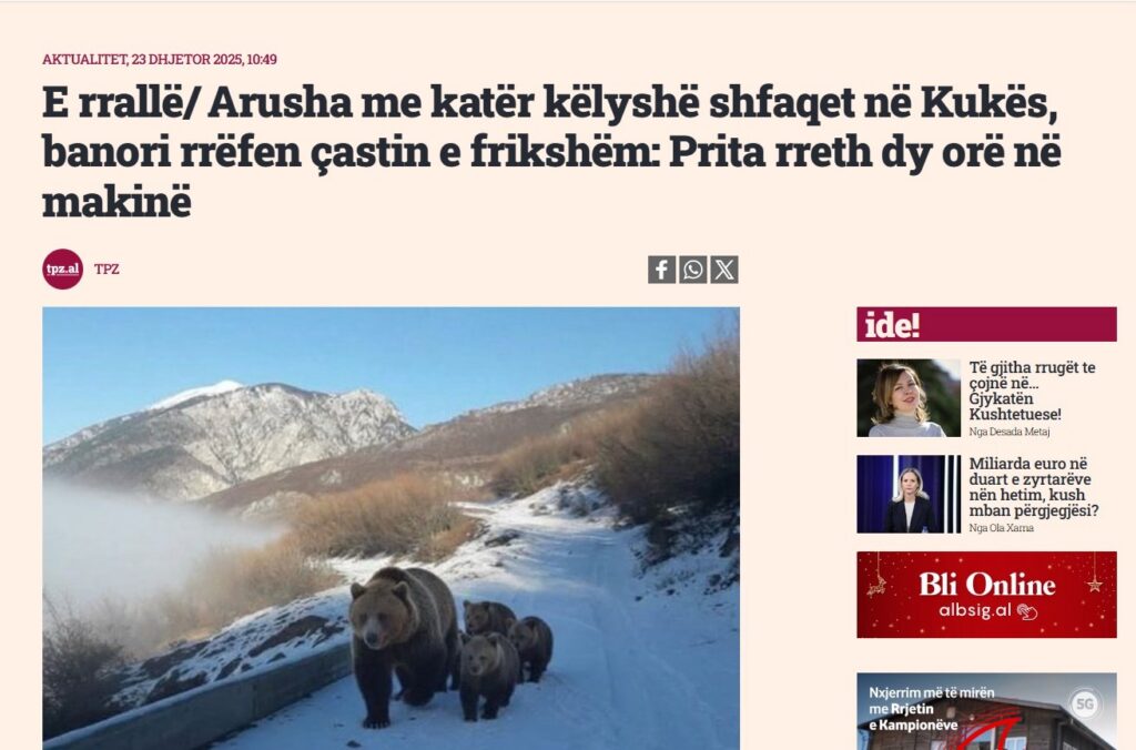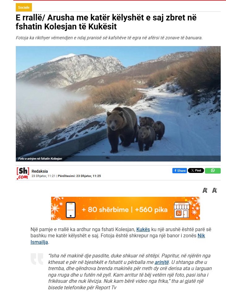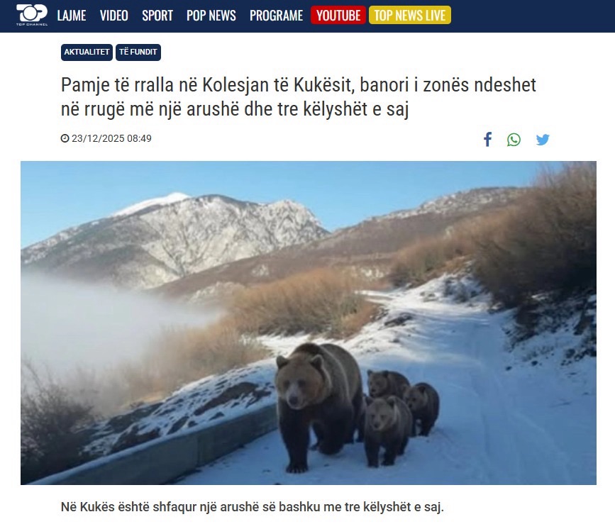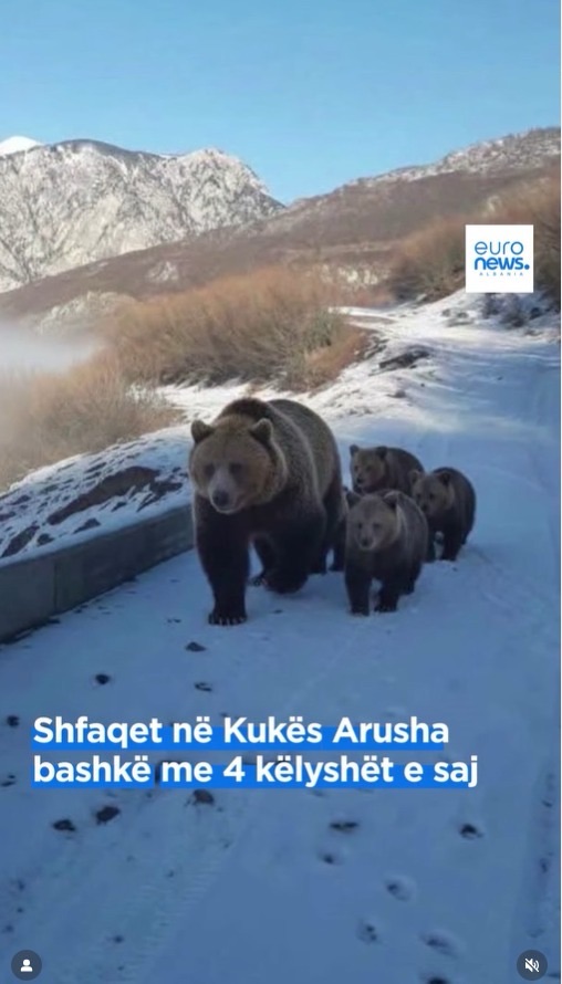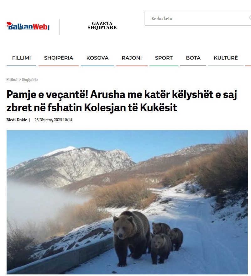 Imazhet e një arushe së bashku me tre këlyshët e saj në fhsatin Kolesjan të Kukësit u shpërndanë me shpejtësi në mediat shqiptare ditën e sotme.