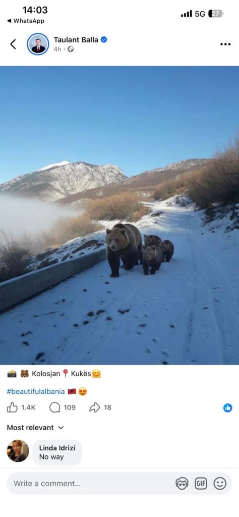 “Isha në makinë dje pasdite, duke shkuar në shtëpi. Papritur, në njërën nga kthesat e për në bjeshkët e fshatit u përballa me arinjtë. U shtanga dhe u tremba, dhe qëndrova brenda makinës për rreth dy orë derisa ata u larguan nga rruga dhe u futën në pyll. Kam arritur të bëj vetëm një foto, pasi isha i frikësuar dhe nuk lëvizja. Nuk kam bërë video nga frika,” tha ai gjatë një bisede telefonike për Report Tv