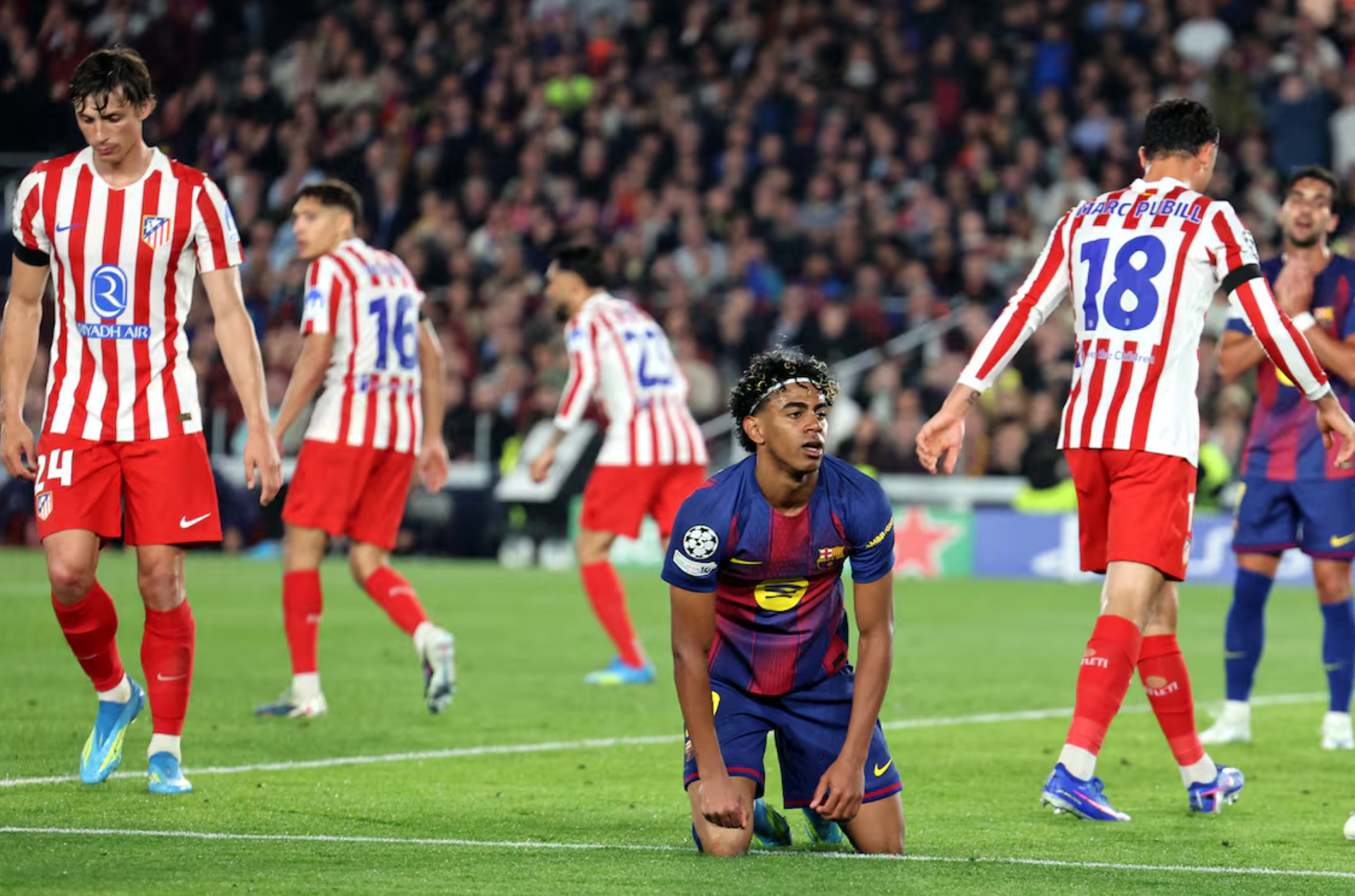 Simeone u detyrua të ndërhynte shpejt në formacion, pasi Hancko u dëmtua në kyçin e këmbës së majtë dhe në vend të tij hyri Pubill. Mbrojtësi katalanas mori një karton të verdhë pak minuta më vonë dhe do të mungojë në kthim për shkak pezullimi, një humbje jo e vogël për mbrojtjen e Atlético-s. Në ato minuta ku Barça dominoi, Lamine u përplas vazhdimisht me murin e fortë mbrojtës të madrilenëve, që në disa momente mbroheshin me gjashtë lojtarë dhe tregonin solidaritet maksimal në çdo aksion.