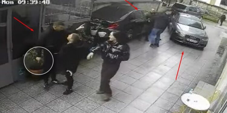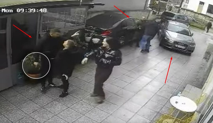 Prezente janë dy gra që përpiqen ta largojnë nga zona, ndërkohë që nga pamjet kuptohet se debati vazhdon në distancë me personin tjetër, i cili dallohet me një kostum blu me vija të bardha. Edhe atë përpiqet ta qetësojë një person tjetër, por situata vazhdon e agravuar.