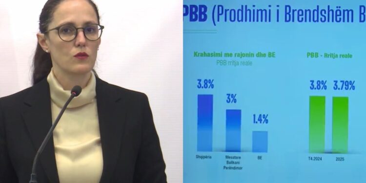Ministrja e Ekonomisë dhe Inovacionit, Delina Ibrahimaj, në një konferencë për shtyp deklaroi se ekonomia shqiptare ka shënuar rritje prej 3.8% në tremujorin e fundit të vitit 2025, duke tejkaluar mesataren e Bashkimit Evropian prej 1.4% dhe atë të vendeve të Ballkanit Perëndimor prej 3%.