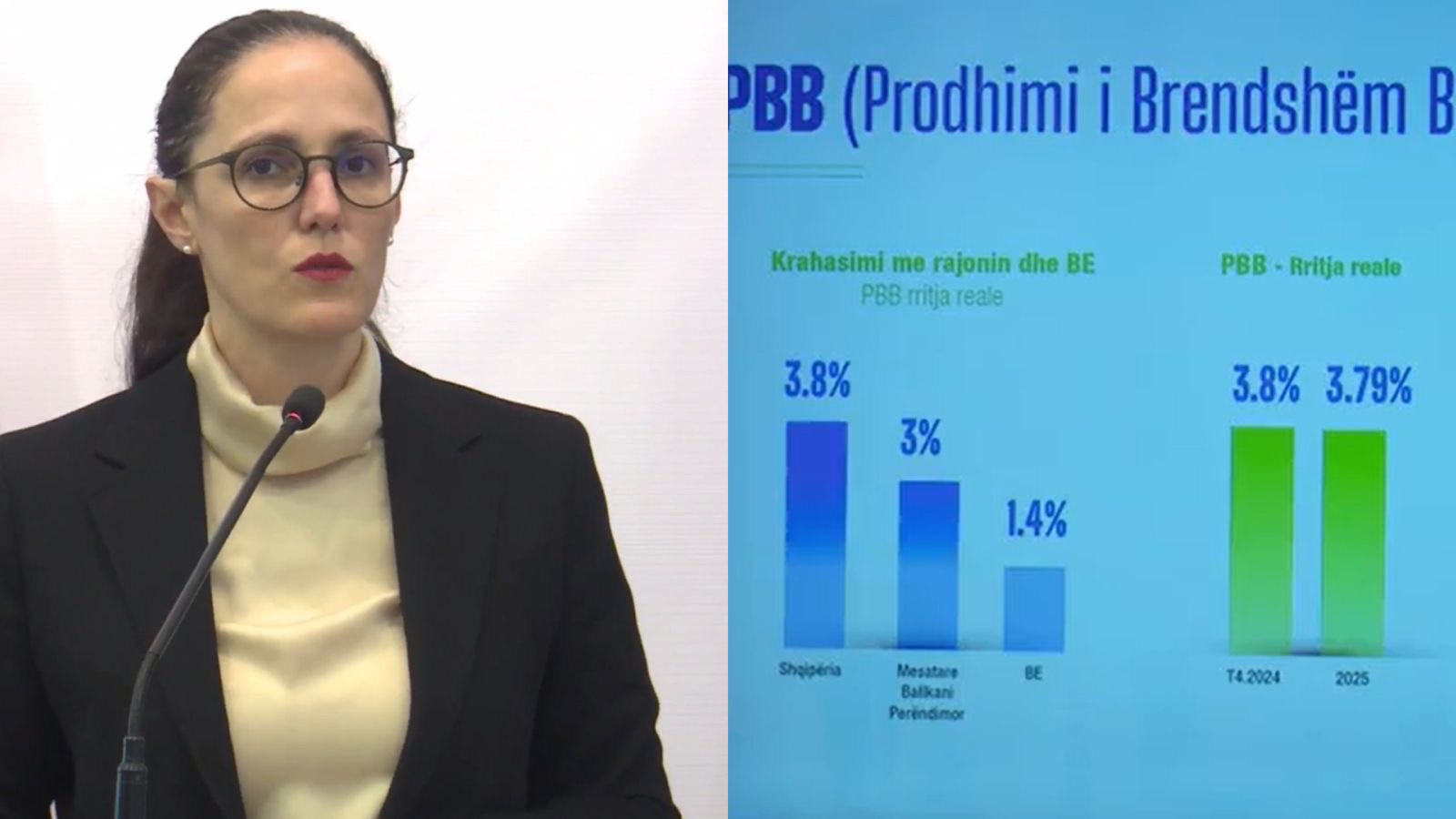 Ministrja e Ekonomisë dhe Inovacionit, Delina Ibrahimaj, në një konferencë për shtyp deklaroi se ekonomia shqiptare ka shënuar rritje prej 3.8% në tremujorin e fundit të vitit 2025, duke tejkaluar mesataren e Bashkimit Evropian prej 1.4% dhe atë të vendeve të Ballkanit Perëndimor prej 3%.