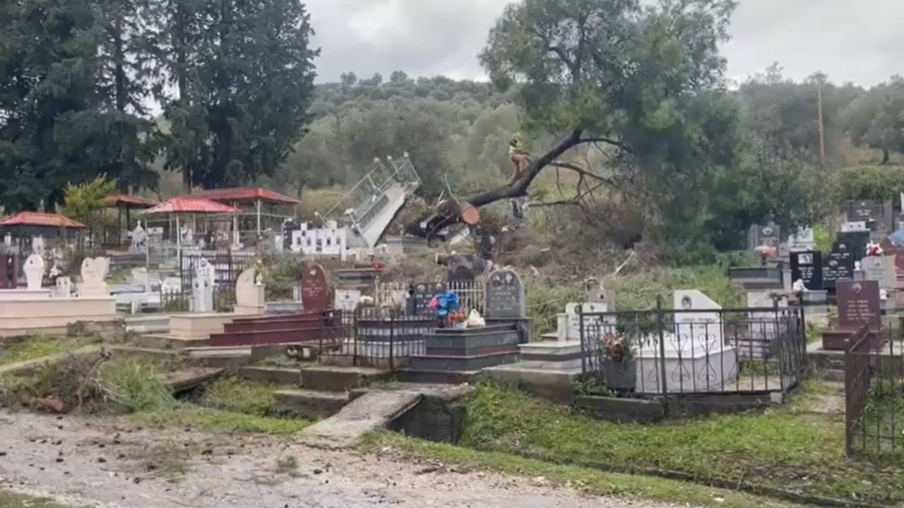 Në orët e para të mëngjesit, një erë e fuqishme, e shoqëruar me reshje shiu dhe lagështi të lartë, shkaktoi rrëzimin e një peme në varrezat e qytetit. Ky incident rezultoi në dëmtimin e disa varreve. Ekipet e Ndërmarrjes së Shërbimeve Publike intervenuan menjëherë në vendngjarje për të prerë dhe larguar pemën e rrëzuar.