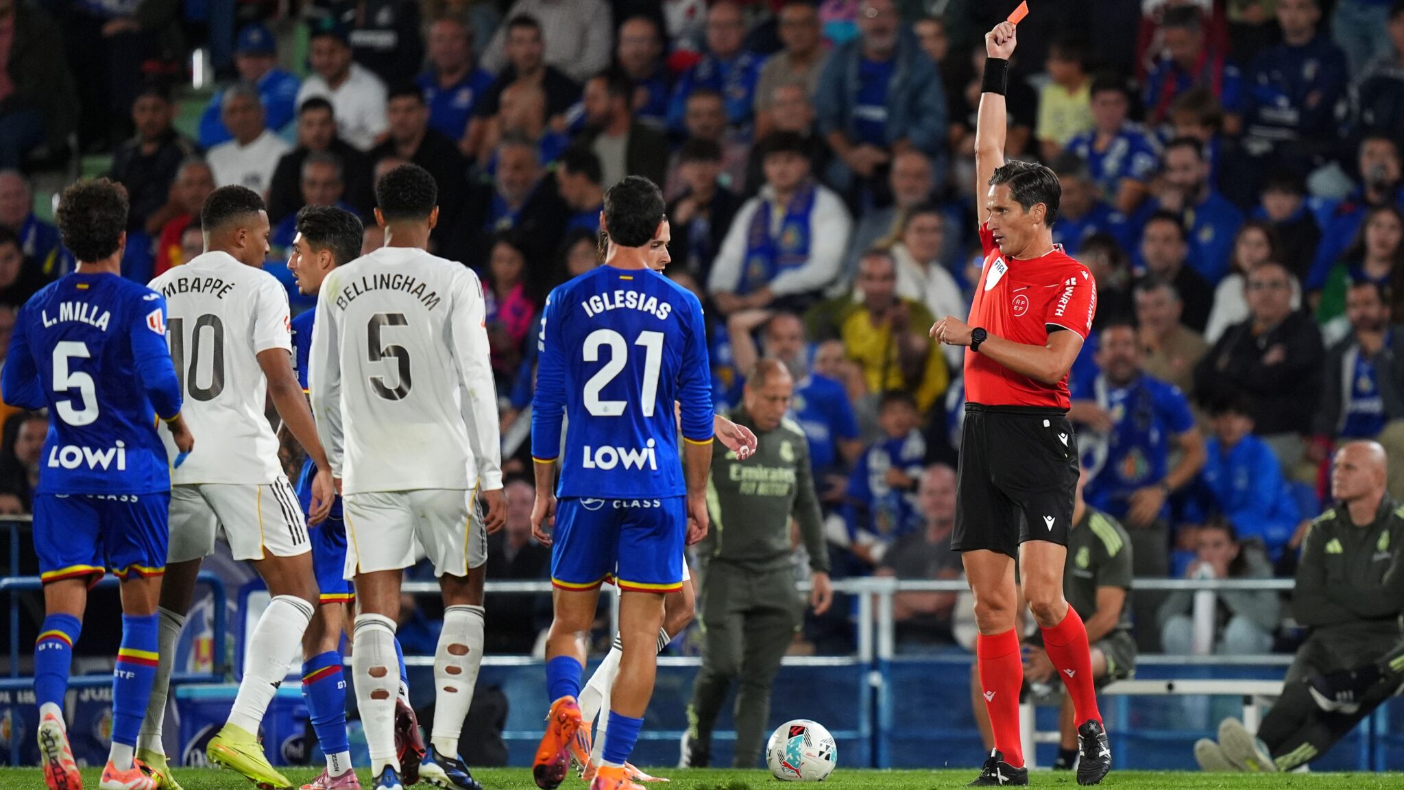 Real Madrid arriti një fitore 1-0 ndaj Getafes në një ndeshje dramatike, ku emocionet ishin të larta dhe tensioni mes lojtarëve të dy ekipeve ishte evidente. Getafe, ekipi pritës, u ndje i revoltuar pas dy vendimeve të kontestuara të arbitrit, që përfshinin një karton të kuq për Allan Nyom dhe një vendim të diskutueshëm të VAR-it.
