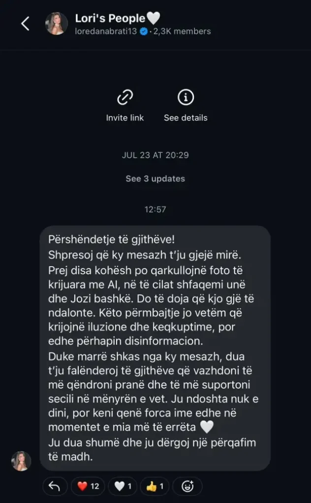 Përmes një mesazhi drejtuar ndjekësve të saj në kanalin “Lori’s People”, Loredana ka sqaruar se këto imazhe nuk janë reale, por janë krijuar nga Inteligjenca Artificiale. Ajo kërkoi që shpërndarja e këtyre fotove të ndalojë menjëherë, duke i cilësuar ato si “dashakeqe” dhe të dëmshme për publikun.