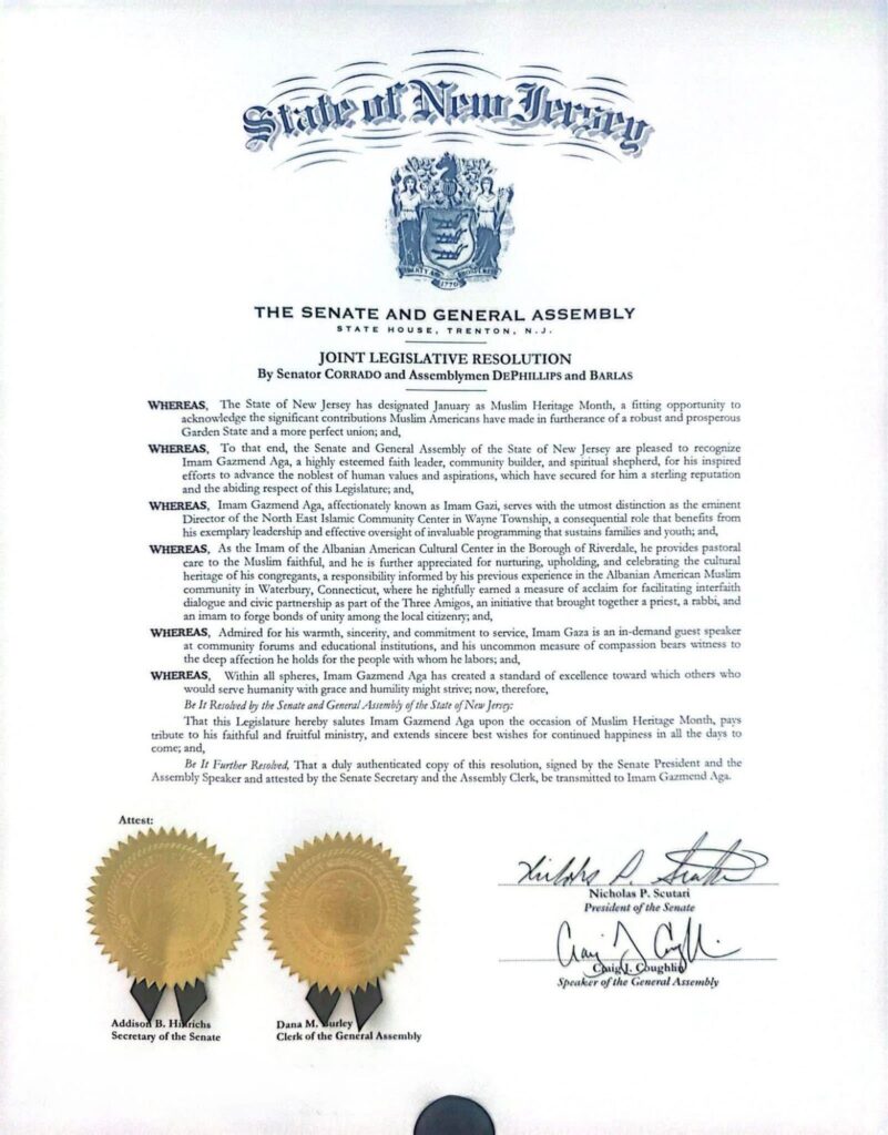 Imam Gazmend Aga është vlerësuar me një certifikatë mirënjohjeje nga shteti i New Jersey-t, përmes një Rezolute Legjislative të Përbashkët të Senatit dhe Asamblesë, si shenjë vlerësimi për punën e tij të jashtëzakonshme në promovimin e harmonisë ndërfetare dhe ndërkulturore.