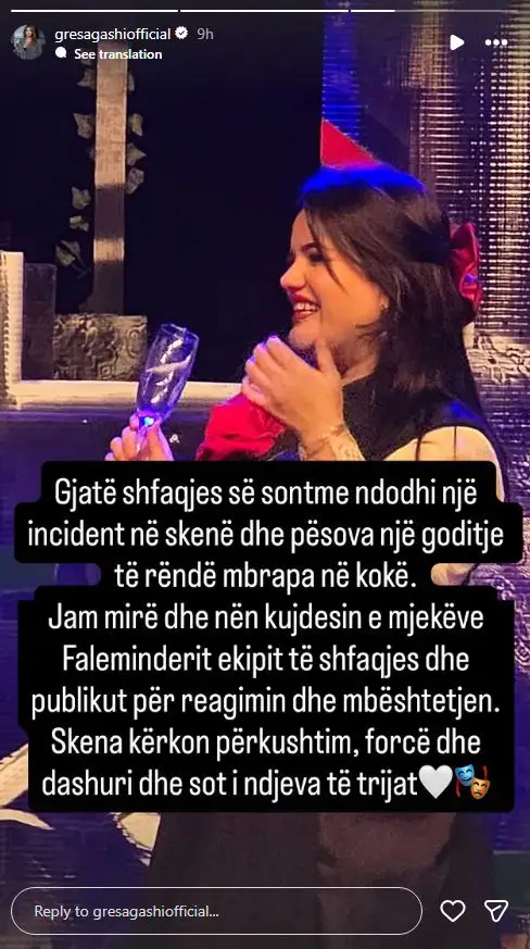 “Gjatë shfaqjes së sontme ndodhi një incident në skenë dhe pësova një goditje të rëndë mbrapa në kokë,” ka shkruar ajo, duke ngritur shqetësim tek ndjekësit dhe adhuruesit e saj.