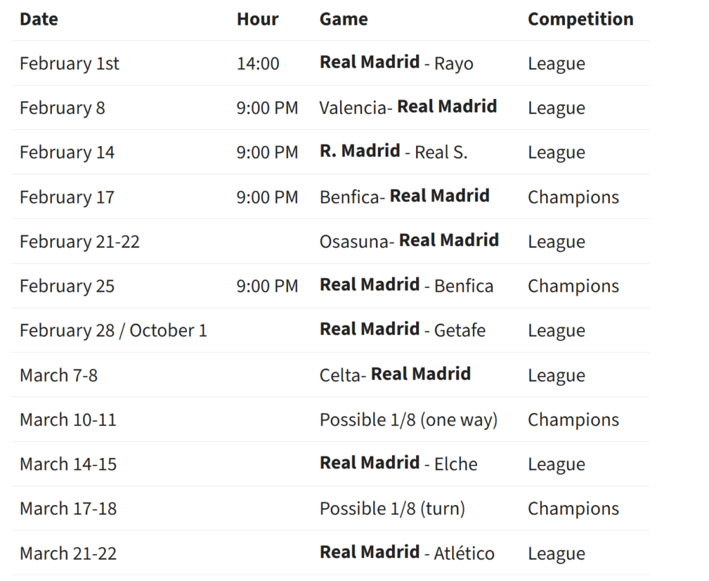 Tani, madrilenët do të luajnë playoff-in ndaj Benfikës, duke e ndërprerë fokusin ekskluziv te La Liga. Para kësaj ka vetëm një pushim të shkurtër, pasi Kupa e Mbretit nuk i përfshin më. Pasojnë tre ndeshje radhazi në kampionat (Rayo, Valencia, Real Sociedad), më pas Osasuna e Getafe, me dy duelet ndaj Benfikës në mes, dhe Celta Vigo.