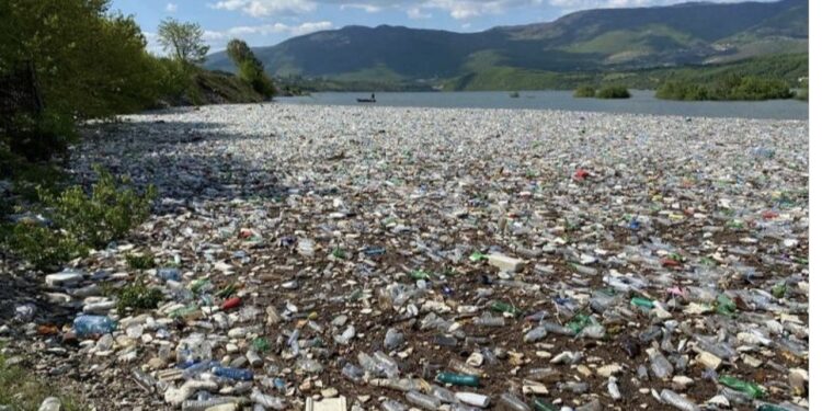Fotoja tregon sipërfaqen e ujit në Liqenin e Fierzës, ku ajo që vihet re është se e gjithë sipërfaqja është mbuluar nga plehrat dhe mbetjet plastike.