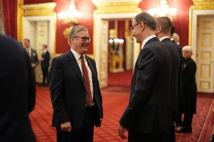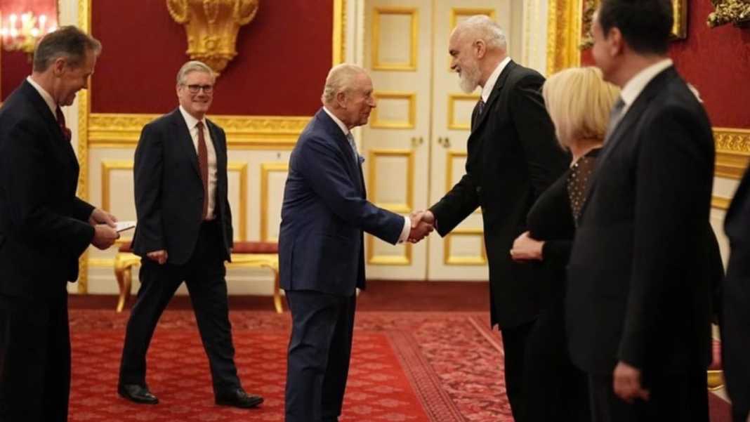 Në foton e publikuar nga ceremonia, shihet momenti kur Rama i shtrin dorën Mbretit Charles, në prani të kryeministrit britanik Keir Starmer dhe liderëve të tjerë rajonalë.