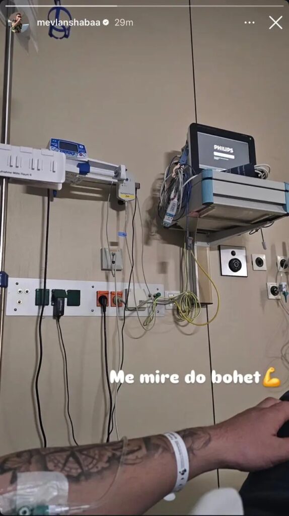 Mevlani ka ndarë një foto në InstaStory, ku shihet me një infuzion, por nuk ka dhënë detaje të tjera mbi gjendjen e tij shëndetësore. Ai ka shkruar vetëm: “Më mirë do bëhet”, duke u munduar disi të qetësojë ndjekësit dhe të afërmit e tij.