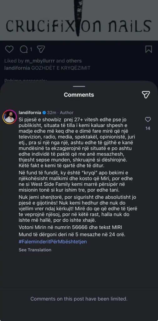 Në komentet e postimit, Landi shton se si pjesë e showbiz-it prej më shumë se 27 vitesh, ka parë shpesh situata edhe më të rënda, por kurrë një reagim kaq të ashpër ndaj një individi. Ai thekson se kritika është e pranueshme, por linçimi publik jo, duke bërë thirrje që çdo gjë të trajtohet me masë dhe përgjegjësi.