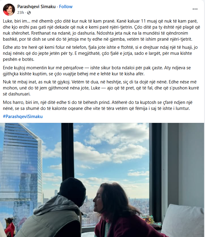 Mos harro, biri im, një ditë edhe ti do të bëhesh prind. Atëherë do ta kuptosh se çfarë ndjen një nënë, se sa shumë do të kalonte oqeane dhe vite të tëra vetëm që fëmija i saj të ishte i lumtur”, ka shkruar Parashqevia.