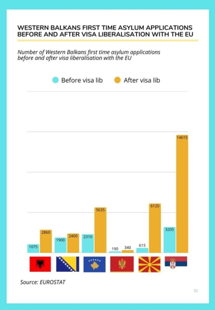 Të dhënat e grafikëve të Eurostat tregojnë qartë se, ndonëse pas liberalizimit numri i kërkesave për azil u rrit në të gjitha vendet e rajonit, Kosova qëndroi në mes të tabelës, me një nivel migrimi shumë më të kontrolluar sesa fqinjët e saj në vitet e para të lëvizjes së lirë me BE-në.