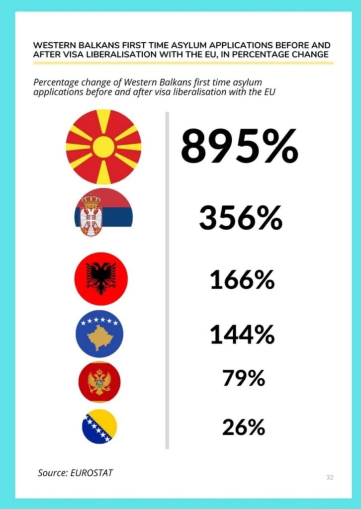 “Ndonëse kërkesat për azil nga Kosova u rritën për 144% në vitin e parë të liberalizimit të vizave, kjo rritje është në fakt mjaft e ultë nëse krahasohet me rritjen e numrit të azilkërkuesve nga vende të tjera të rajonit në vitin e tyre të parë të liberalizmit të vizave. Në rastin e Maqedonisë së Veriut numri i azilkërkuesve u rrit për 895%, në rastin e Serbisë 356%, ndërsa në rastin e Shqipërisë 166%. Vetëm Mali i Zi dhe Bosnja arritën të mbajnë rritjen e numrit të azilkërkuesve nën 100%.”