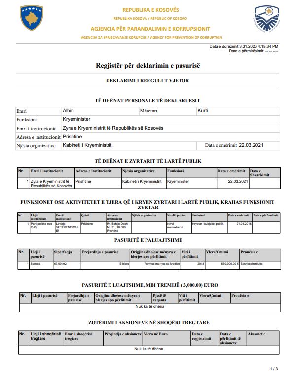 Sa i përket pasurive të paluajtshme dhe atyre të luajtshme nuk ka ndonjë ndryshim. Si pasuri të paluajtshme, Kurti ka deklaruar banesën e bashkëshortes, e vlerësuar 530 mijë euro.