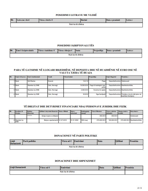 Para të gatshme në emër të tij ka deklaruar 16.41 euro, në emër të bashkëshortes 19500 euro, me burim nga paga dhe trashëgimi nga prindi, 2000 euro kursime të vajzës dhe 50 euro tjera të vajzës, që thotë se burojnë si dhuratë nga familjarët.