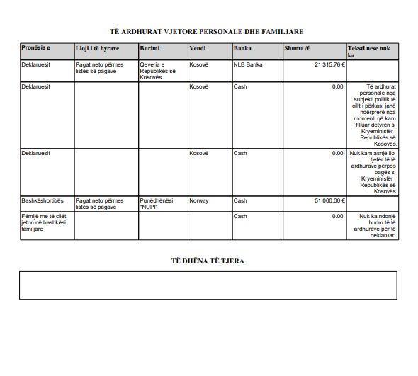 Vjet ai i kishte deklaruar 1800 euro kursime. Si borxh ka deklaruar kredinë e bashkëshortes në vlerë të mbetur 160 mijë euro dhe ka renditur qiranë e banesës, që tani e paguan 350 euro, nga 250 sa e paguante vjet. Te të hyrat vjetore, Kurti ka renditur 21 mijë e 315 euro nga paga si kryeministër dhe 51 mijë euro të bashkëshortes.