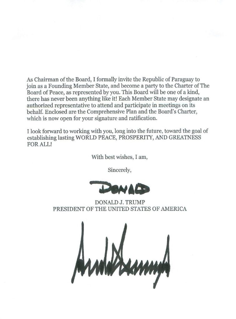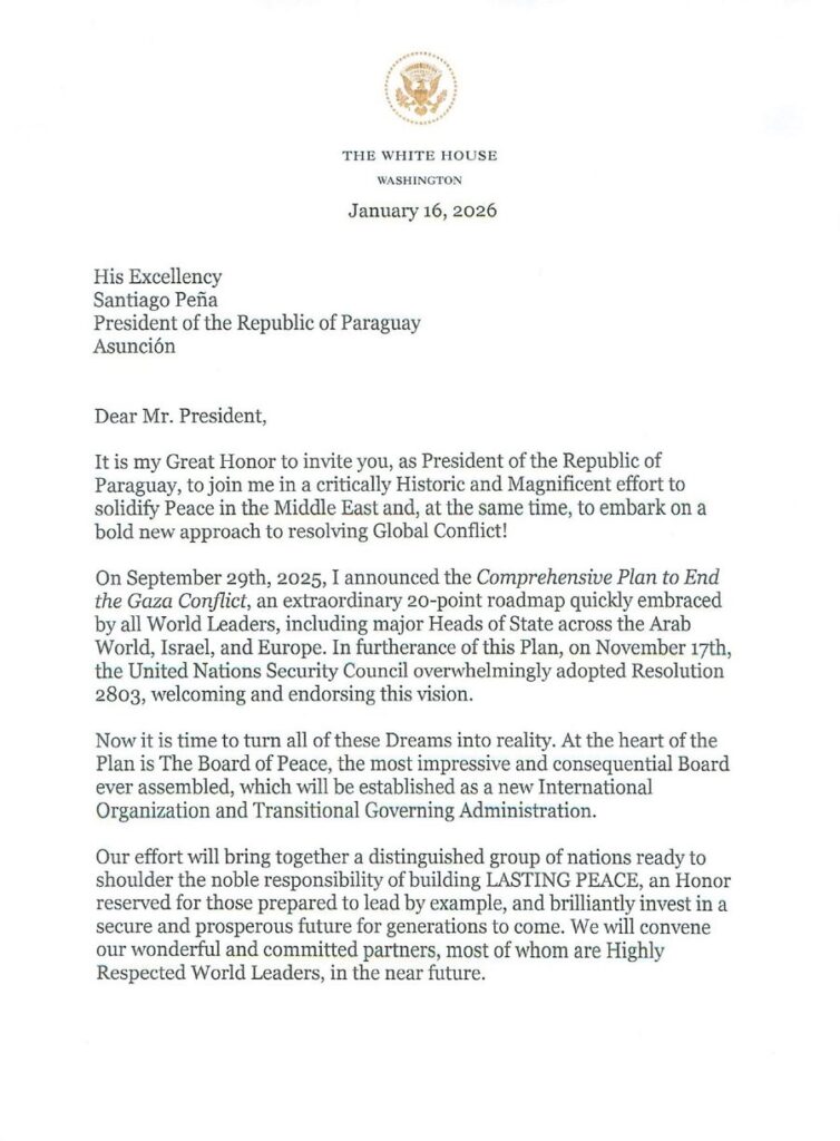 Më 16 janar 2026, Presidenti Trump, në cilësinë e themeluesit të Bordit të Paqes, u ka dërguar një letër presidentëve dhe kryeministrave të rreth 100 vendeve të botës, duke i ftuar për t’u bërë pjesë e këtij Bordi, duke miratuar Kartën e tij dhe caktuar një përfaqësues zyrtar që do të marrë pjesë në takimet që do të zhvillohen në kuadër të këtij koalicioni.