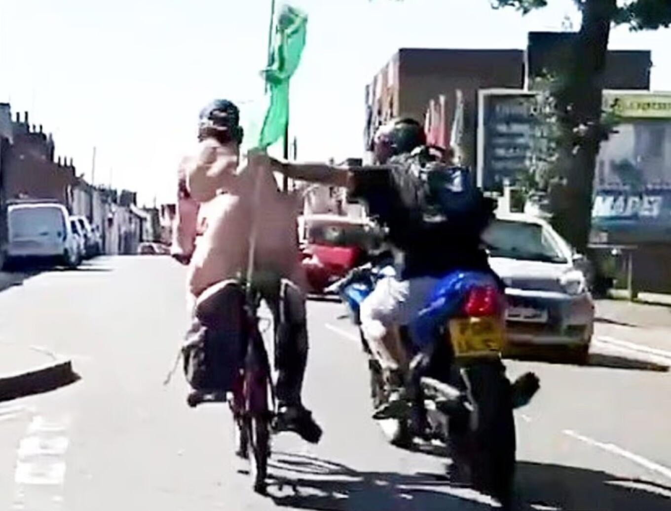 Një incident i çuditshëm po qarkullon në internet, ku një çiklist i zhveshur goditet nga një motoçiklist në Colchester, Essex. Videoja e publikuar nga Daily Mail tregon çiklistin, i cili ka një flamur të gjelbër në shpinë dhe mban një kapelë të gjelbër, teksa pedalon nëpër rrugët e qytetit. Momenti i dhunës është filmuar, dhe tregon motoçiklistin që afron me shpejtësi dhe tallet me çiklistin, për ta goditur papritur me grusht, duke e hedhur atë me forcë në trotuar.