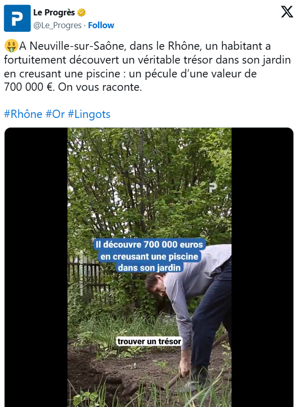 Sipas gazetës rajonale Le Progrès, burri gjeti pesë shufra ari dhe disa monedha, të mbështjella me kujdes në thasë plastikë një zbulim që i ndryshoi jetën papritur.