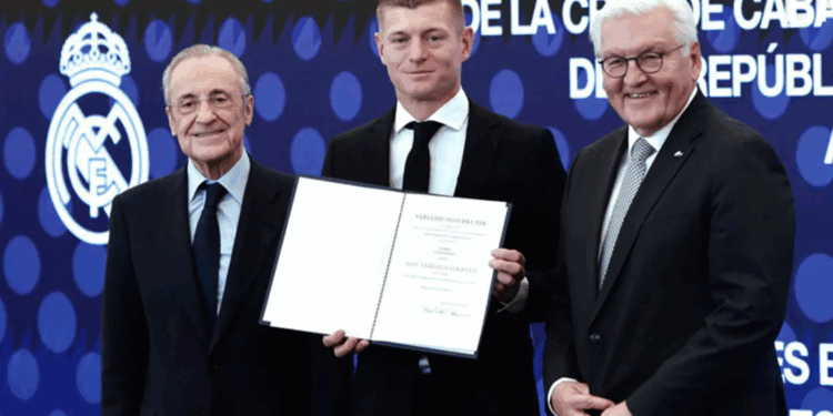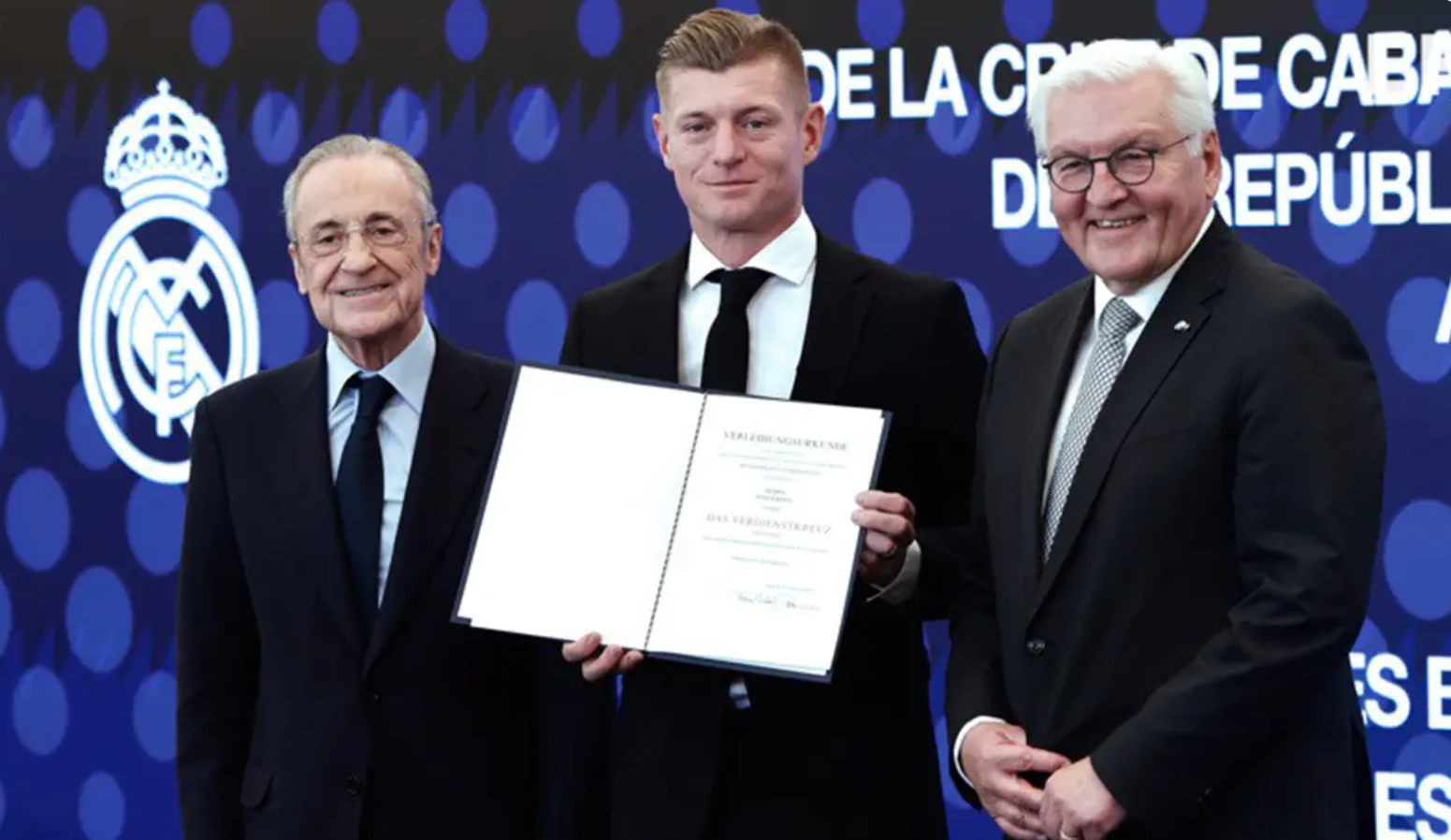 Sot në “Santiago Bernabéu” u zhvillua ceremonia ku ish‐mesfushori 35‐vjeçar i Real Madridit dhe Gjermanisë, Toni Kroos, u nderua me Kryqin e Kalorësit të Urdhrit të Meritës së Republikës Federale të Gjermanisë për kontributin e tij të jashtëzakonshëm ndaj kombit.