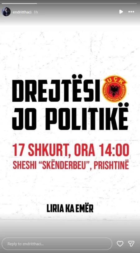 Thirrja është bërë përmes një postimi në rrjetet sociale, ku Thaçi ka shpërndarë një poster me mbishkrimin “Drejtësi, jo politikë”, duke ftuar qytetarët të marrin pjesë në marshimin e paralajmëruar më 17 shkurt, në ora 14:00, në Sheshin Skënderbeu në Prishtinë.