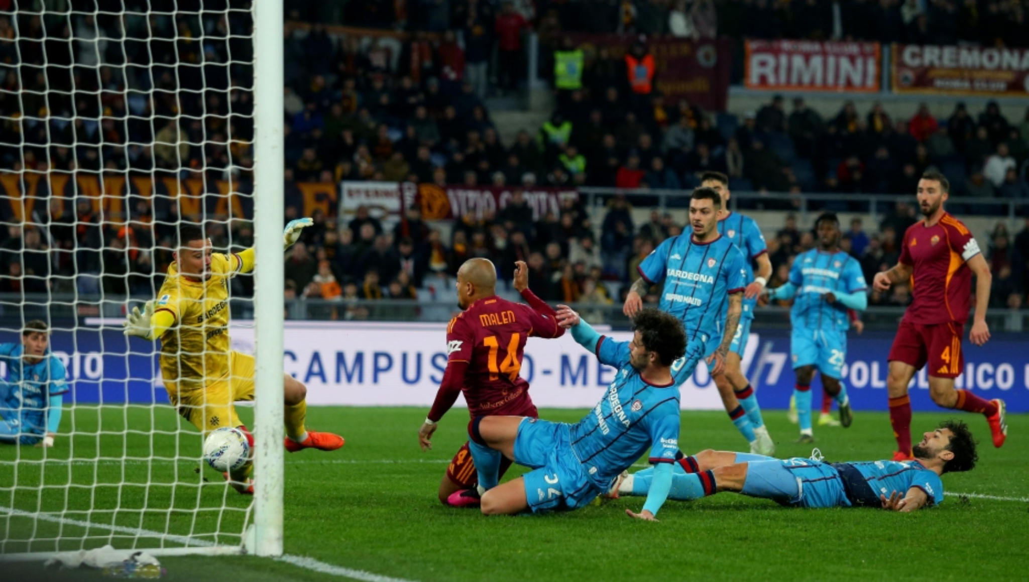 Goli i parë erdhi në minutën e 25-të, kur Malen përfitoi nga asistimi i Mancinit dhe e dërgoi topin në rrjetë për 1-0, duke i dhënë Romës qetësi dhe kontroll të ndeshjes. Cagliari, që vinte pas tri fitoreve radhazi në kampionat, u përpoq të reagojë, por pa arritur të krijojë rrezik serioz.