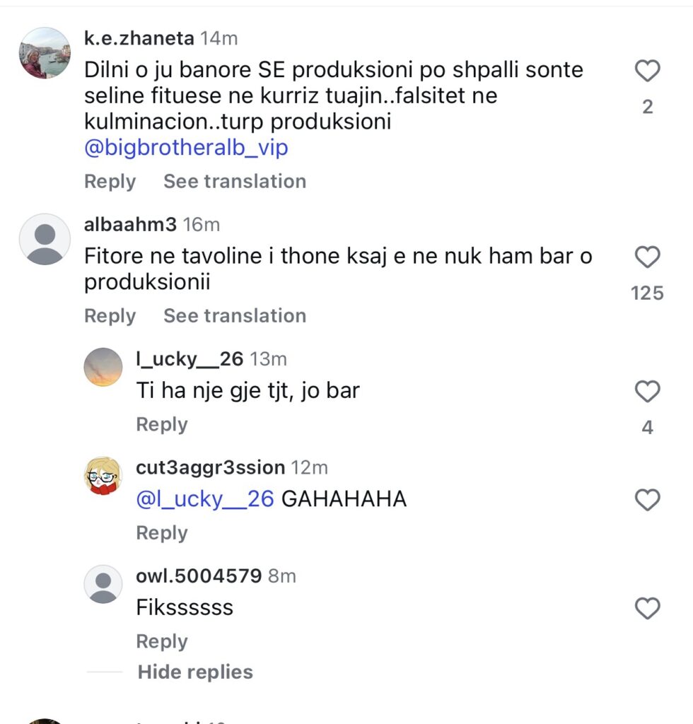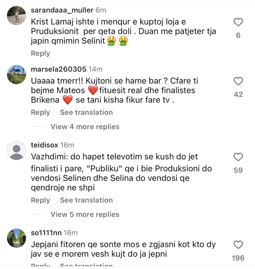 Në postimin e “Big Brother” në Instagram, komentuesit kanë ndarë mendime se produksioni ka zgjedhur që sonte Selin si fituese të programit dhe asgjë ska më rëndësi.