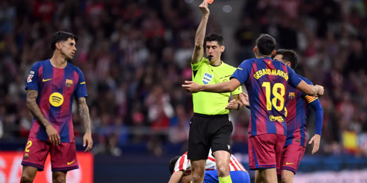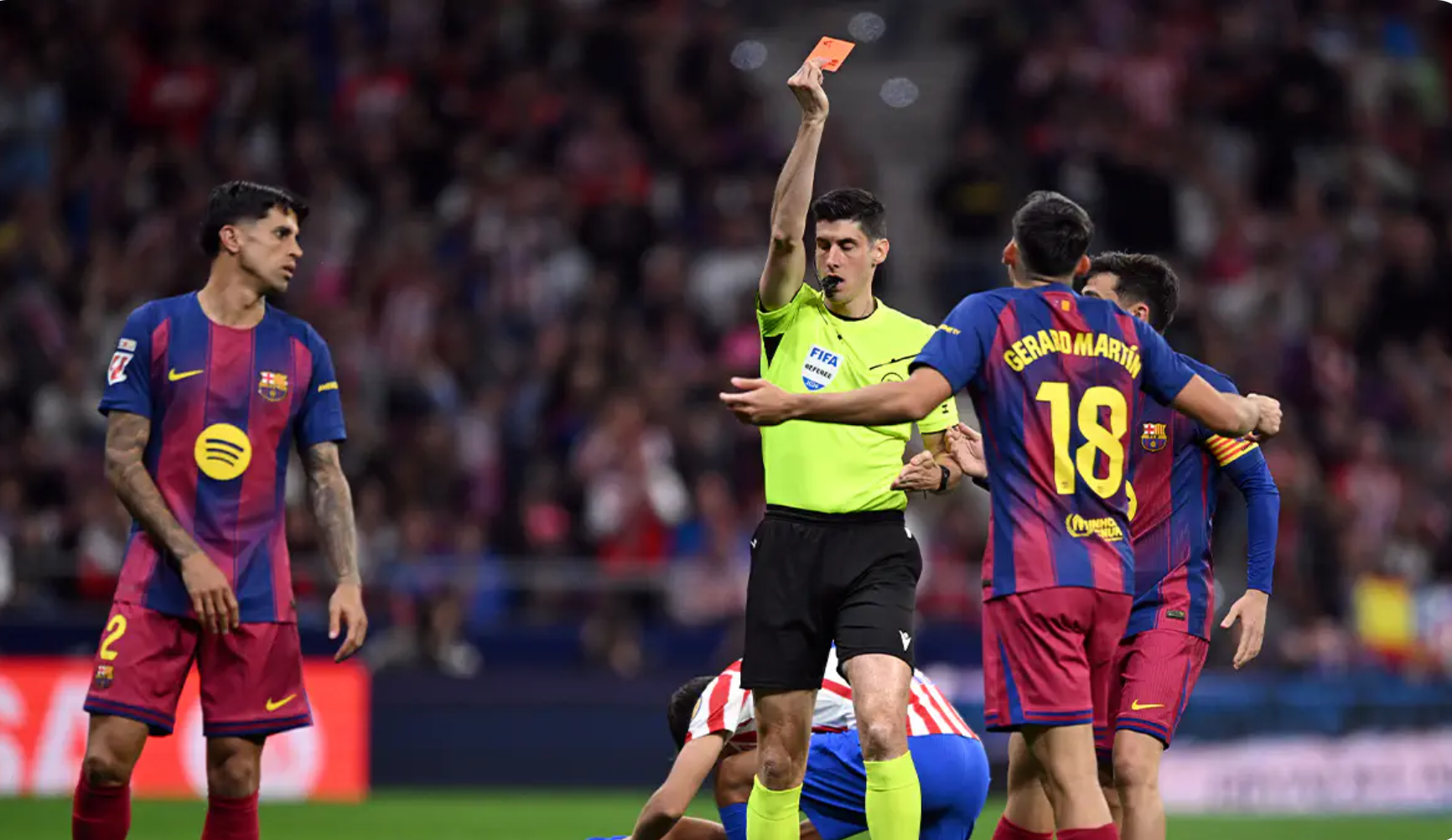Polemika lidhet me një episod ku Gerard Martin i Barcelonës kreu një ndërhyrje të rrezikshme ndaj Thiago Almada të Atlético-s. Arbitri i tregoi menjëherë karton të kuq të drejtpërdrejtë Martin. Megjithatë, pasi arbitri i VAR-it, Melero Lopez, i kërkoi Busquets të rishikonte pamjet, kartoni i kuq u anulua dhe Gerard Martin qëndroi në fushë, duke u ndëshkuar vetëm me karton të verdhë.