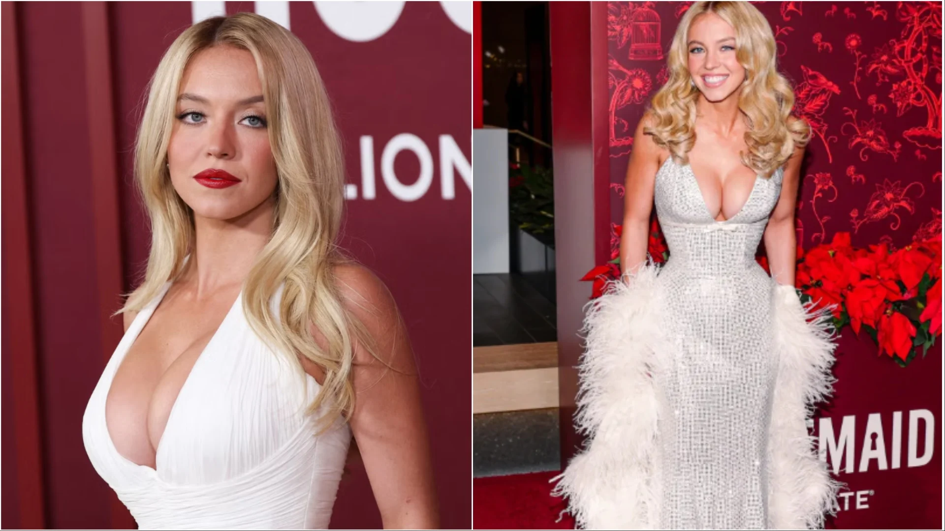 Flokët e saj bjonde janë stiluar në mënyrë dramatike, duke u shtuar një make-up të guximshëm me maskara të zezë dhe buzëkuq të kuq. Ajo dha një ndihmë të fundit pamjes së saj me aksesorë si një telefon i artë dhe një maskë kostumi. Në postimet e tjera të markës në Instagram, Sweeney debutoi gjithashtu një babydoll-dress dhe pjesë të tjera të koleksionit, duke treguar gamën e gjerë të stilit të saj.