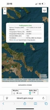 Një tërmet me magnitudë 4.6 të shkallës Rihter u regjistrua në orën 23:04, në zonën detare pranë ishullit Skyros në Greqi.