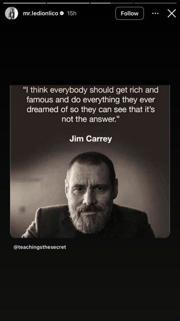 Ai publikoi një thënie të famshme të Jim Carrey: “Unë mendoj se të gjithë duhet të bëhen të pasur dhe të famshëm, që të kuptojnë se kjo nuk është përgjigjja”.