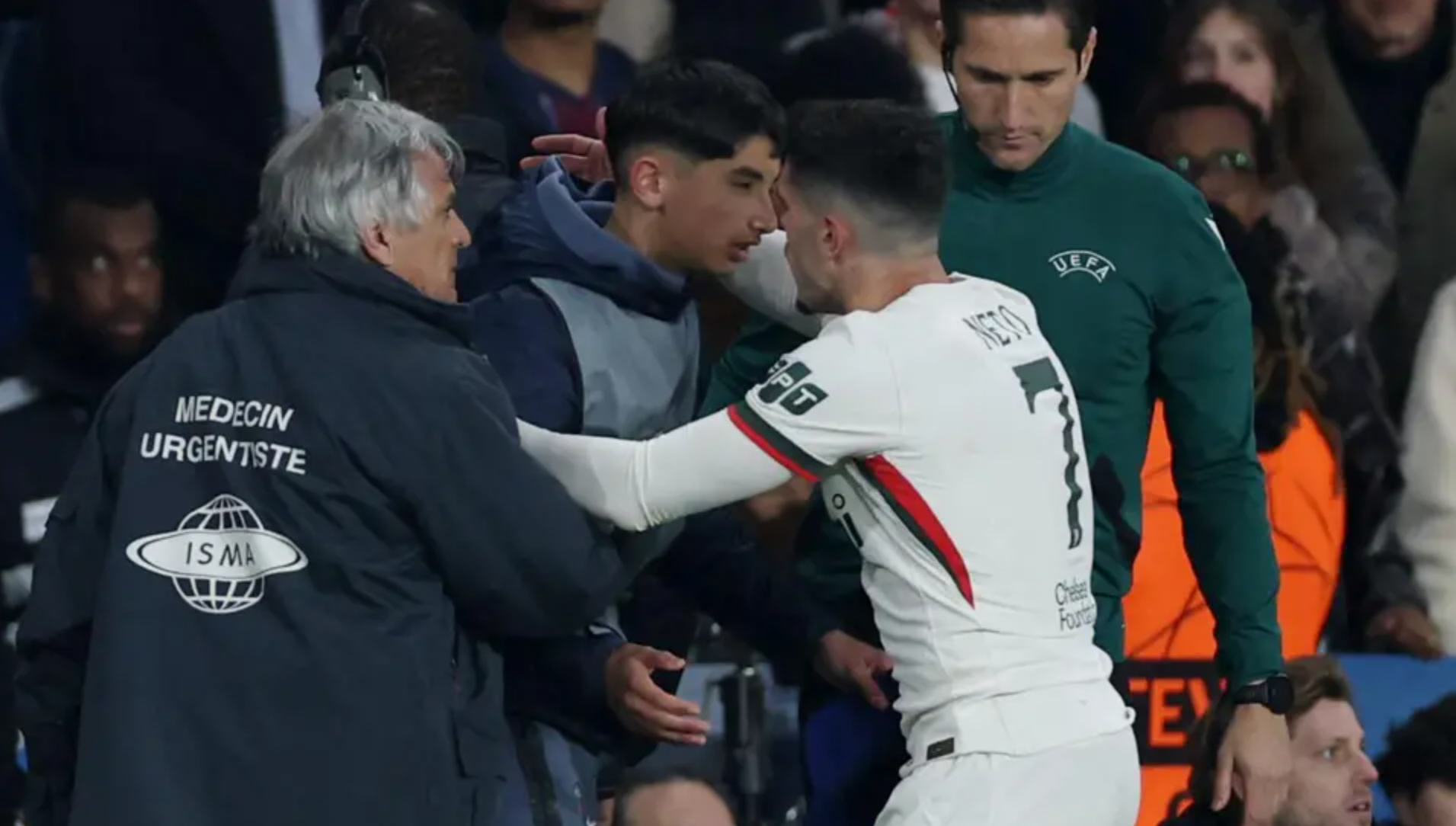 Futbollisti portugez 26-vjeçar shtyu një mbledhës topash në minutat shtesë të sfidës së parë të 1/8-ave në “Parc des Princes”, takim që Chelsea e humbi 5-2 ndaj PSG-së. Si pasojë e shtyrjes, i riu ra nga karrigia, ndërsa episodi shkaktoi edhe tension mes lojtarëve të të dy skuadrave.