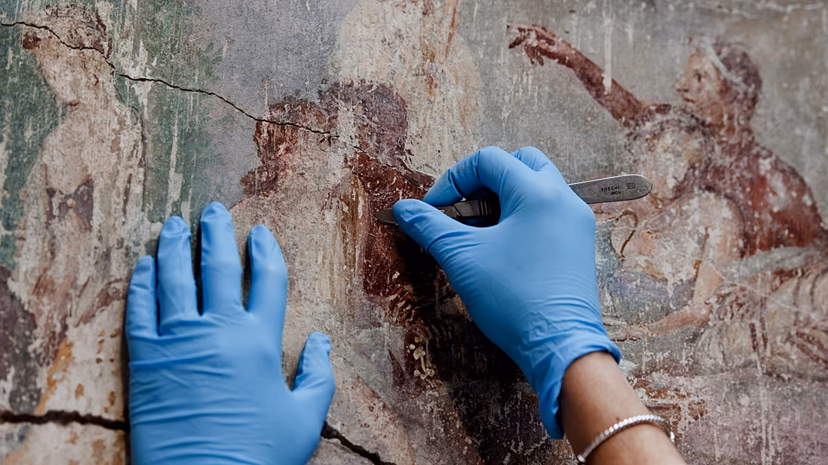 Një ekip konservatorësh ka filluar punë për të zbuluar një freskë të kuqe në Villën Poppaea, e cila ndodhet pranë Pompeit. Kjo vilë, që dikur shërbente si pallat argëtimi në Romën e Lashtë, u shkatërrua nga erupzioni i Vezuvit më 79 pas Krishtit. Konservatorët, të pajisur me helmetë mbrojtëse, po heqin hirin e shekujve që e mbulonte këtë pjesë të historisë, duke e bërë të mundur që për herë të parë, publiku të shohë rezultatet e rinovimit.