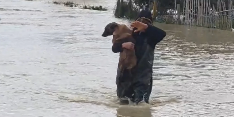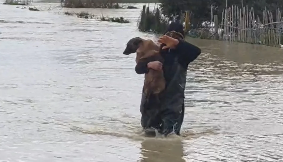 Në një video të siguruar nga Ilirianews shihet një banor që ka marrë qenin në krahë duke e shpëtuar nga përmbytjet.