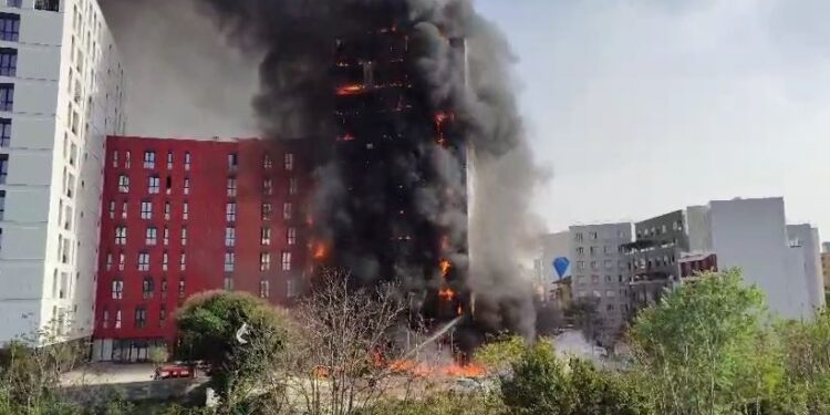 Sipas raportimeve, nga zjarri është shkrumbuar fasada e kompleksit, ndërsa zjarrfikësit janë duke evakuuar banorët.